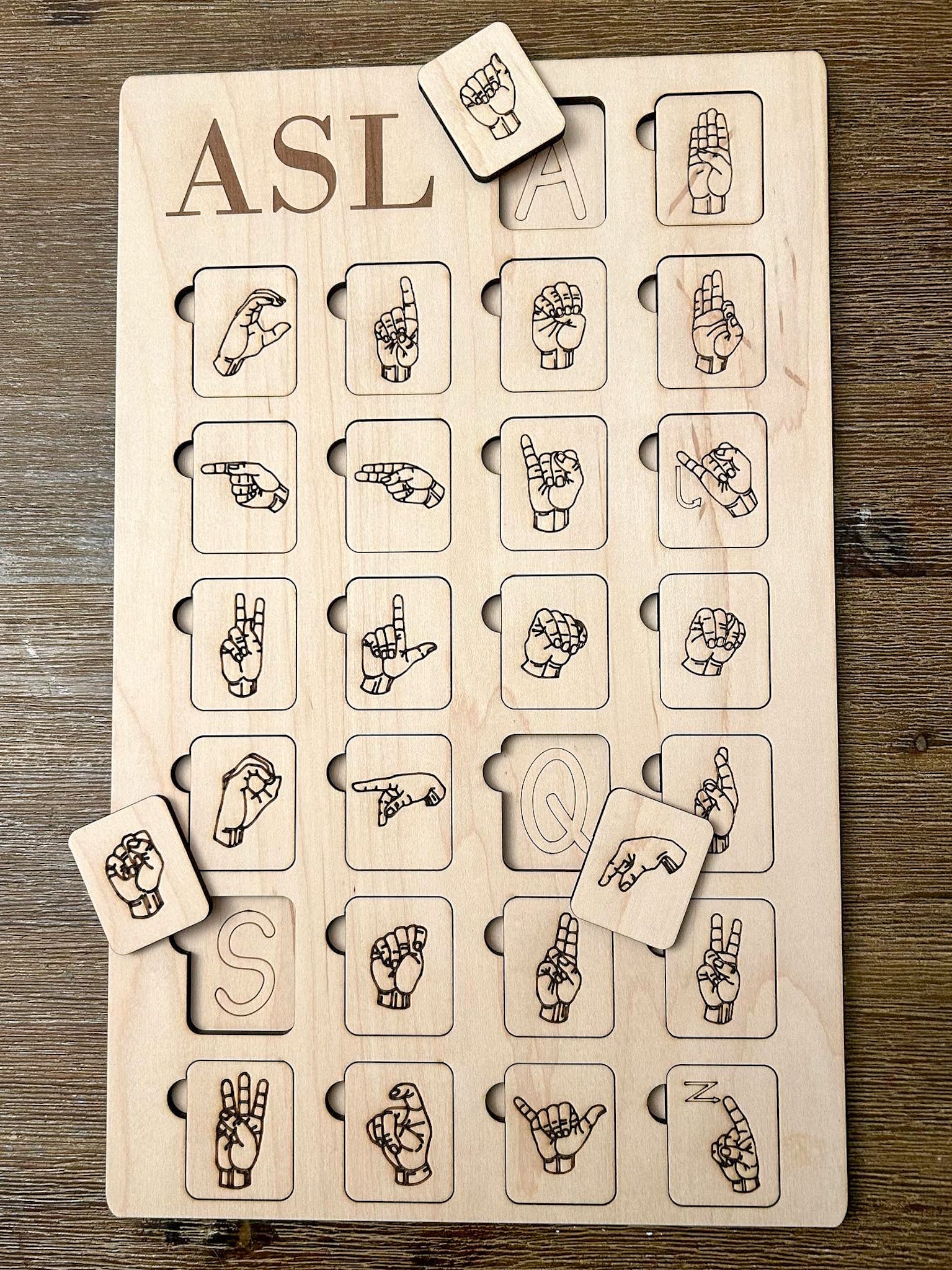 Practice matching the tiles on the board to the appropriate place. Also, use the tiles individually to spell and repeat simple words in sign language.