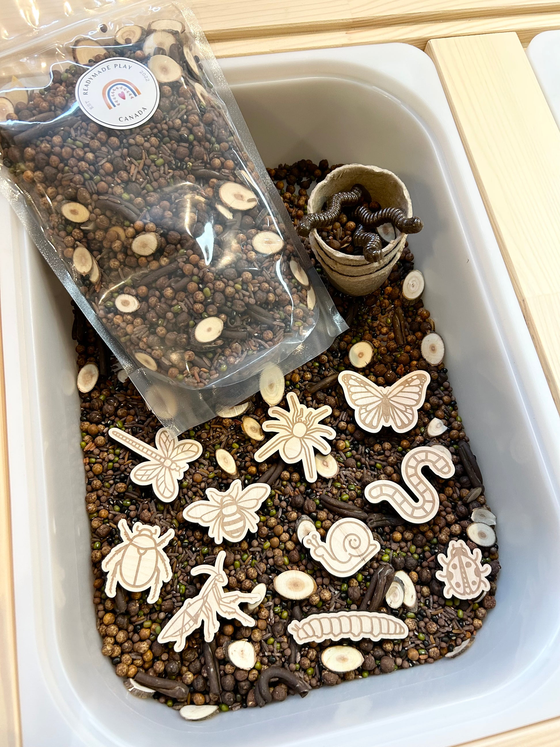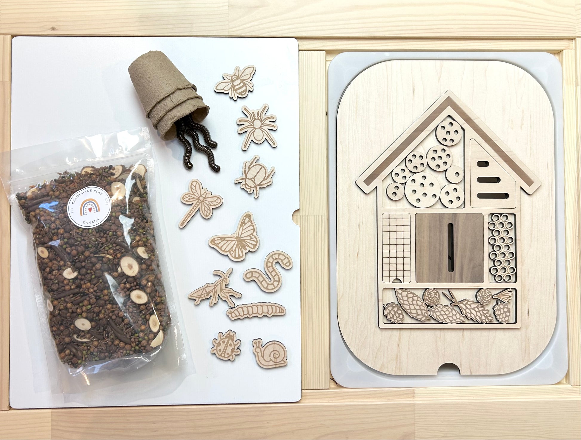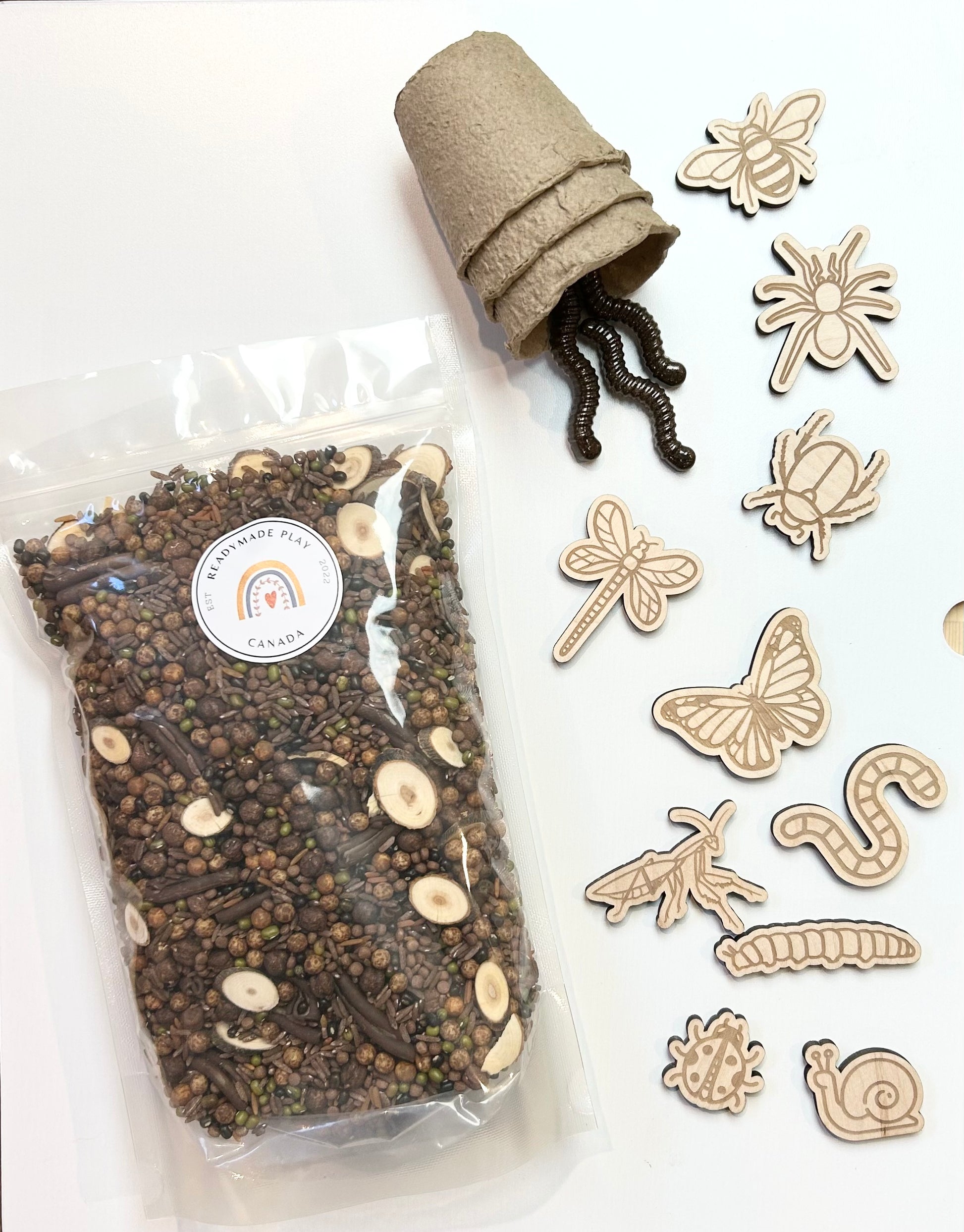 - Full kit: bug hotel insert, 10 wooden bugs, 3 peat pots, 3 resin worms, 4.5 cup dirt scented filler from Readymade Play Canada