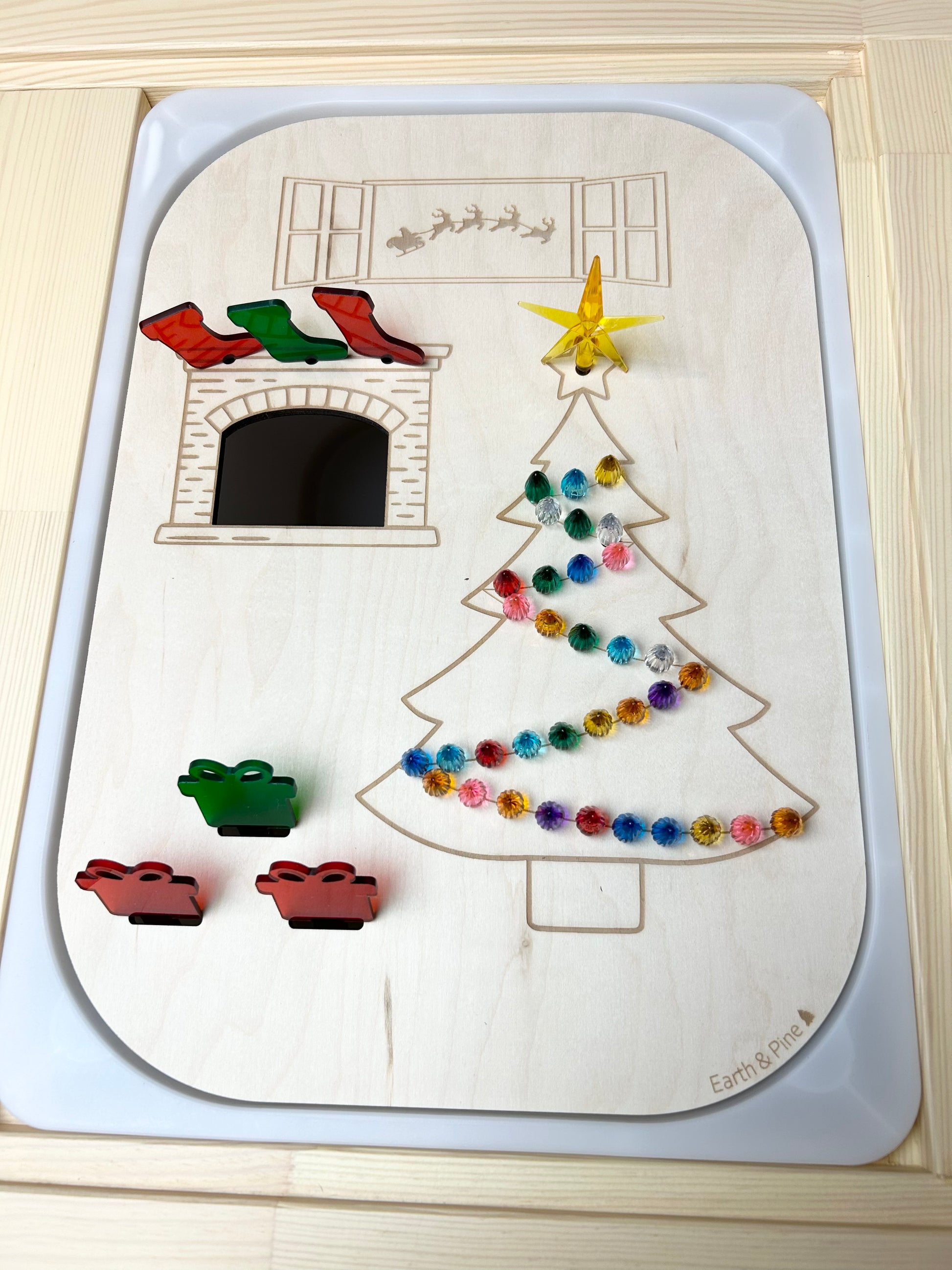 This large Christmas scene insert includes 3 acrylic stocking and 3 acrylic present pegs. All in red and green translucent acrylic.