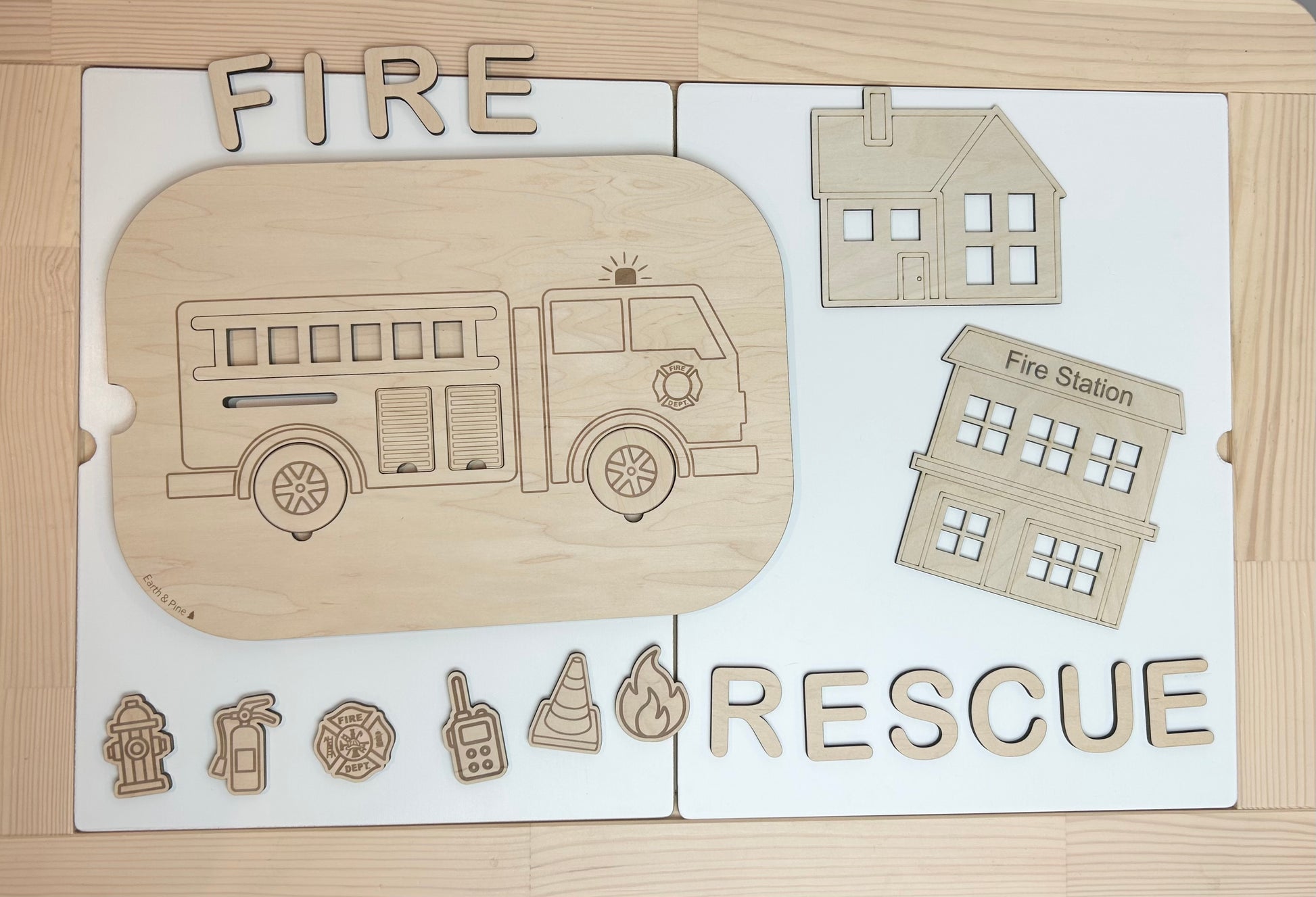 Available to purchase items individually (insert, loose parts, building cut-outs) or purchase the entire kit which includes the bonus “FIRE” and “RESCUE” wooden word letters, insert, loose parts and 2 building cut-outs.