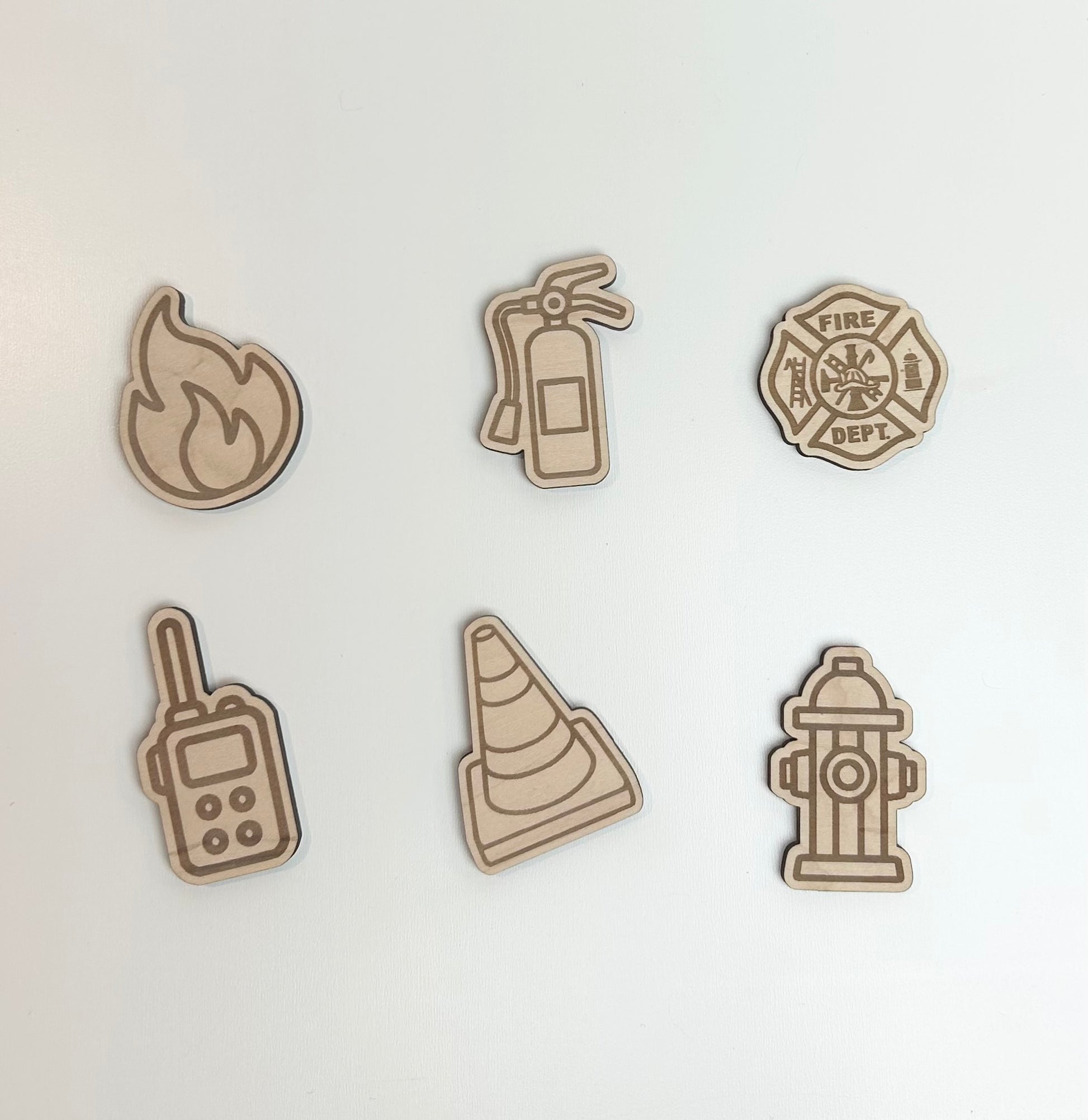 Loose parts include wooden engraved cut outs of: a cone, walkie-talkie, badge, flame, fire hydrant and fire extinguisher.