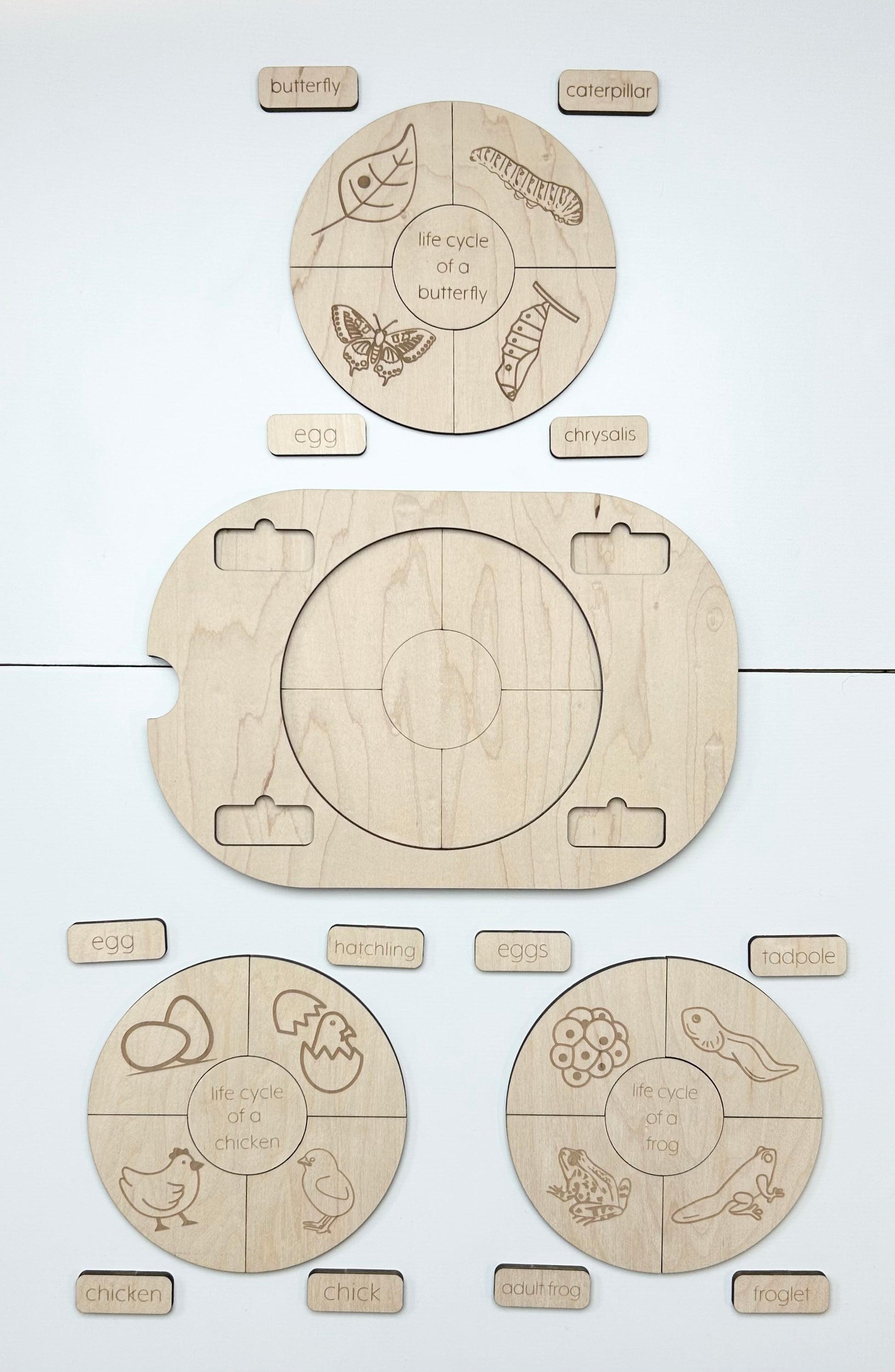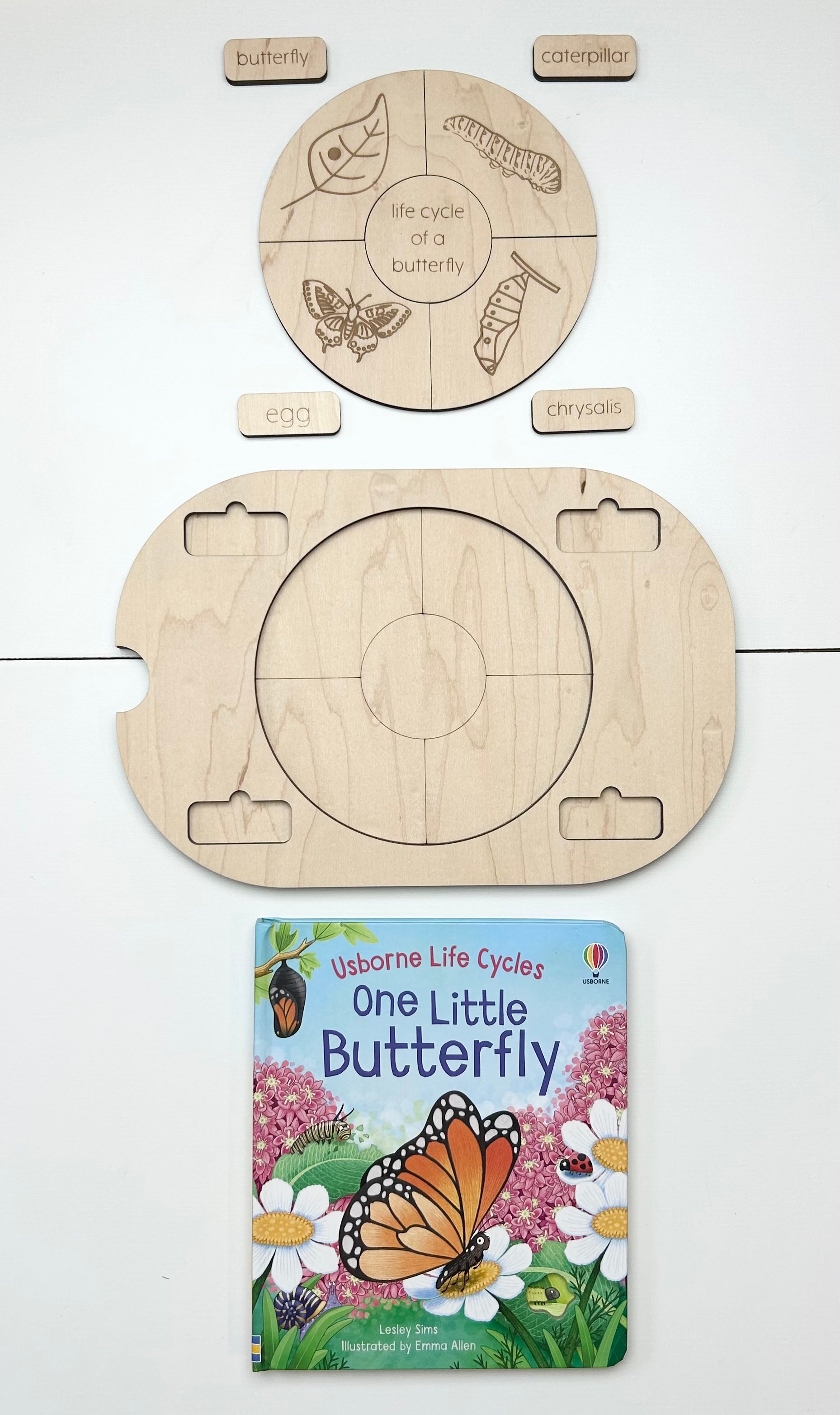 Explore the world of life cycles with our puzzle style insert featuring the: butterfly, chicken, frog and bee life stages.