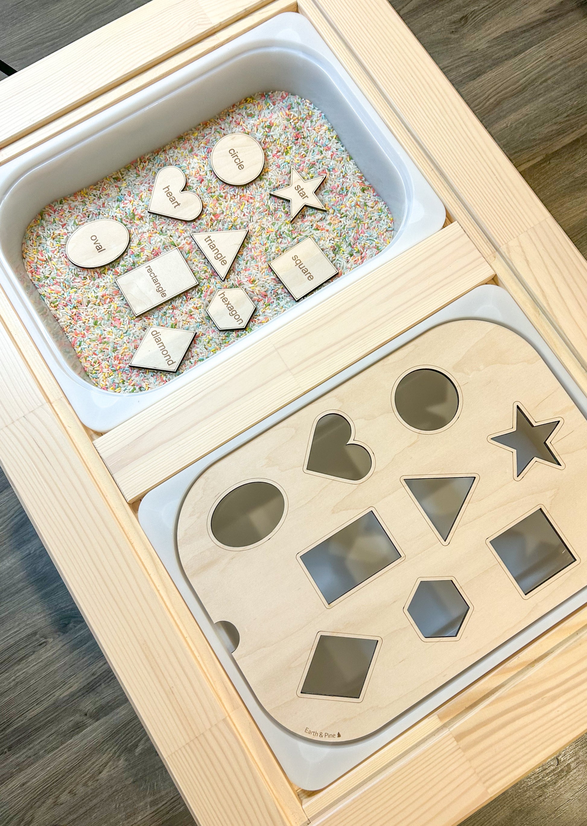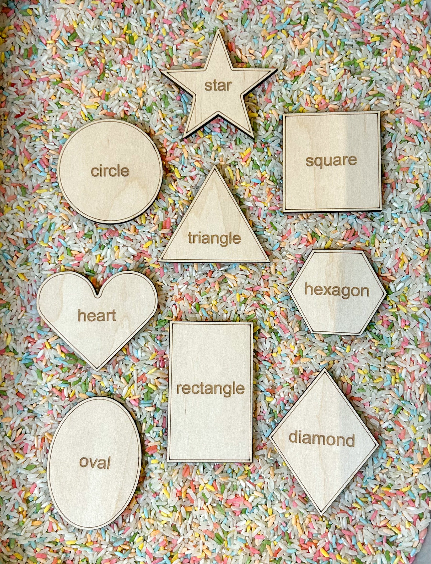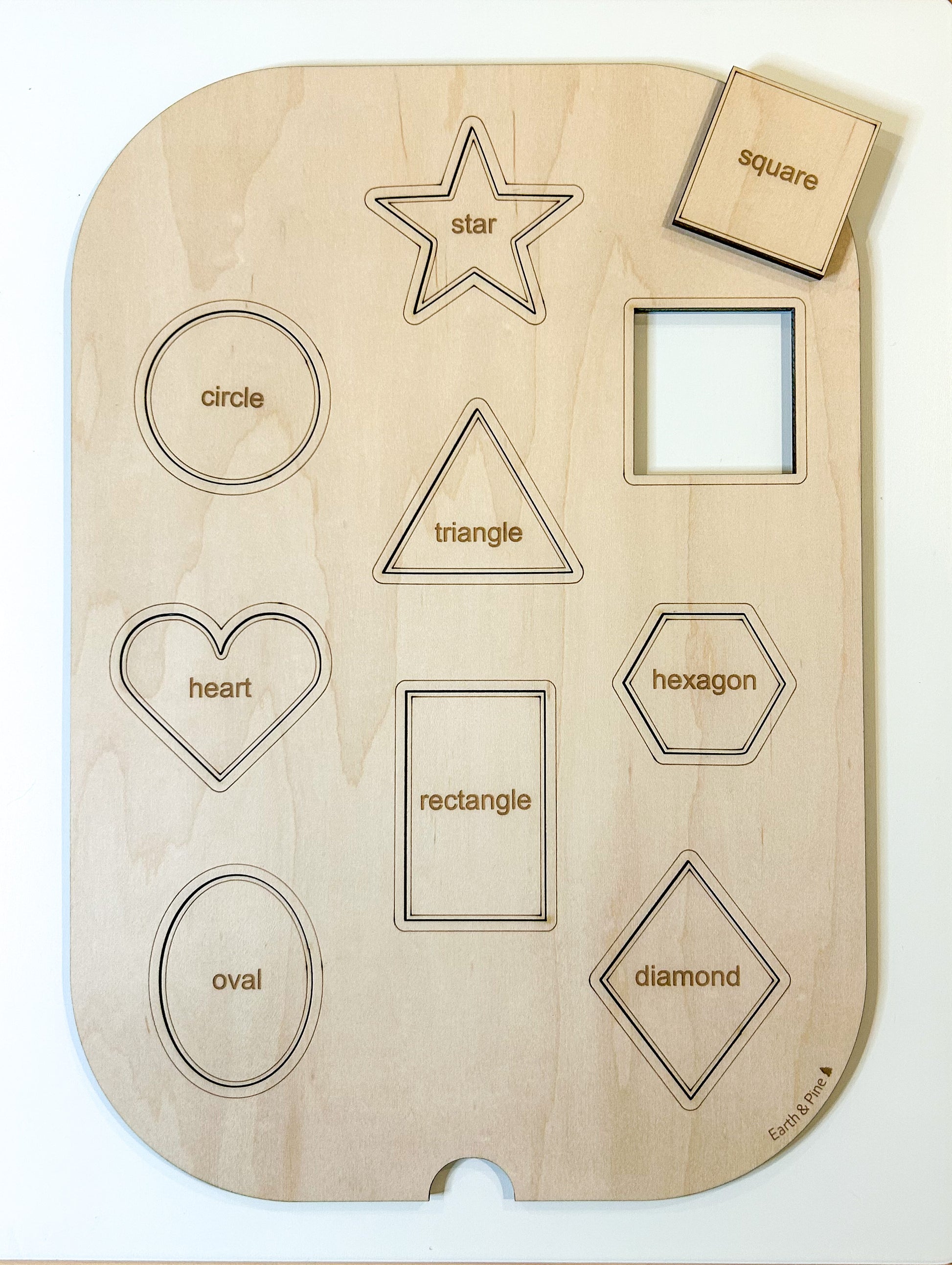 - large wood insert with acrylic outline around shape holes, includes 9 acrylic shapes (with or without shape names engraved)