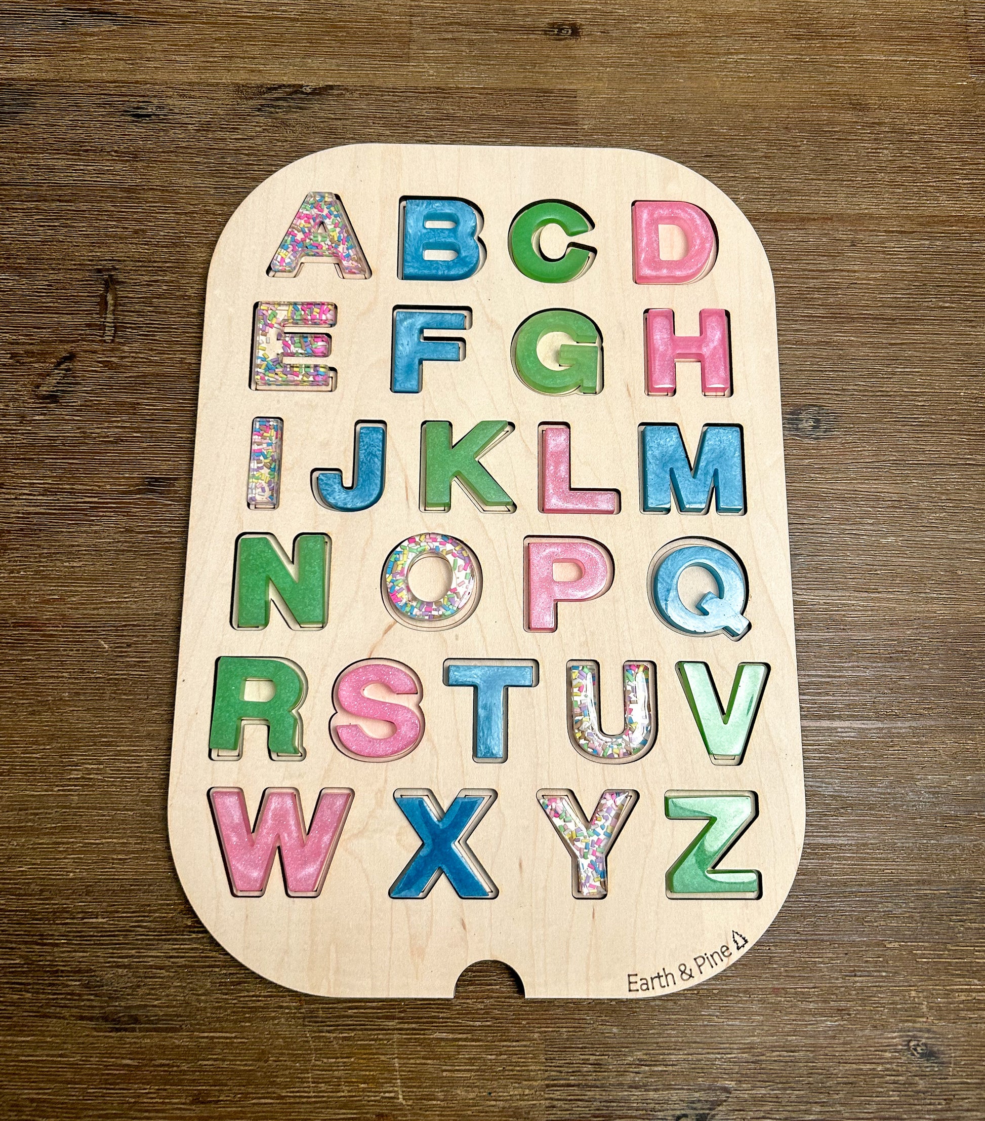 No sensory table? No problem! Check out our Resin letter puzzle board.