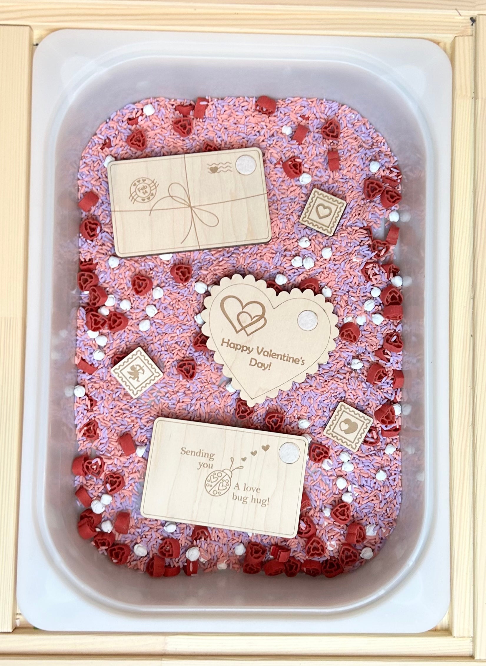Time to spread some love with these Valentine’s themed letters & cards. Each set of 3 cards includes 3 removable stamps (attached with velcro). Mix and match stamps or hide them in your sensory bin and play post office!